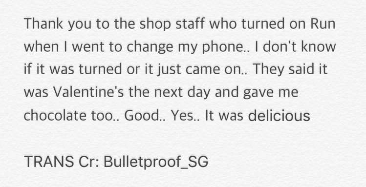 @BTS_twt 携帯変えに行った時にRUNをそっと流してくれた直営店の職員さんに感謝します..流してくれたのかただ流れていたのかはわからないけど..バレンタインが明日という事でチョコレートもくださり..good..はい..美味しかったです..Thanks. Twitter will use this to make your timeline better. UndoUndo