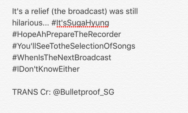 (翻譯)幸好 那樣也搞笑.. #SUGA哥啊 #Hope啊直笛準備好 #歌曲選曲自己看著辦 #下次放送是何時 #我也不知道 RT @BTS_twt: 다행이다 그래도 웃겼어... #슈가형이야 #홉아리코더준비해라 #노래선곡은알아서해 #다음방송은언제 #나도몰라