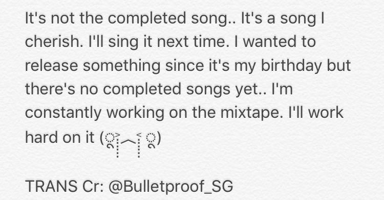 @BTS_twt (翻譯)不是完成的歌曲..是珍惜的歌曲 之後會公開喔 是生日說什麼也想公開 但還不是完成的歌曲...mixtape持續製作中 會用心製作(ू˃̣̣̣̣̣̣︿˂̣̣̣̣̣̣ ू)Thanks. Twitter will use this to make your timeline better. UndoUndo