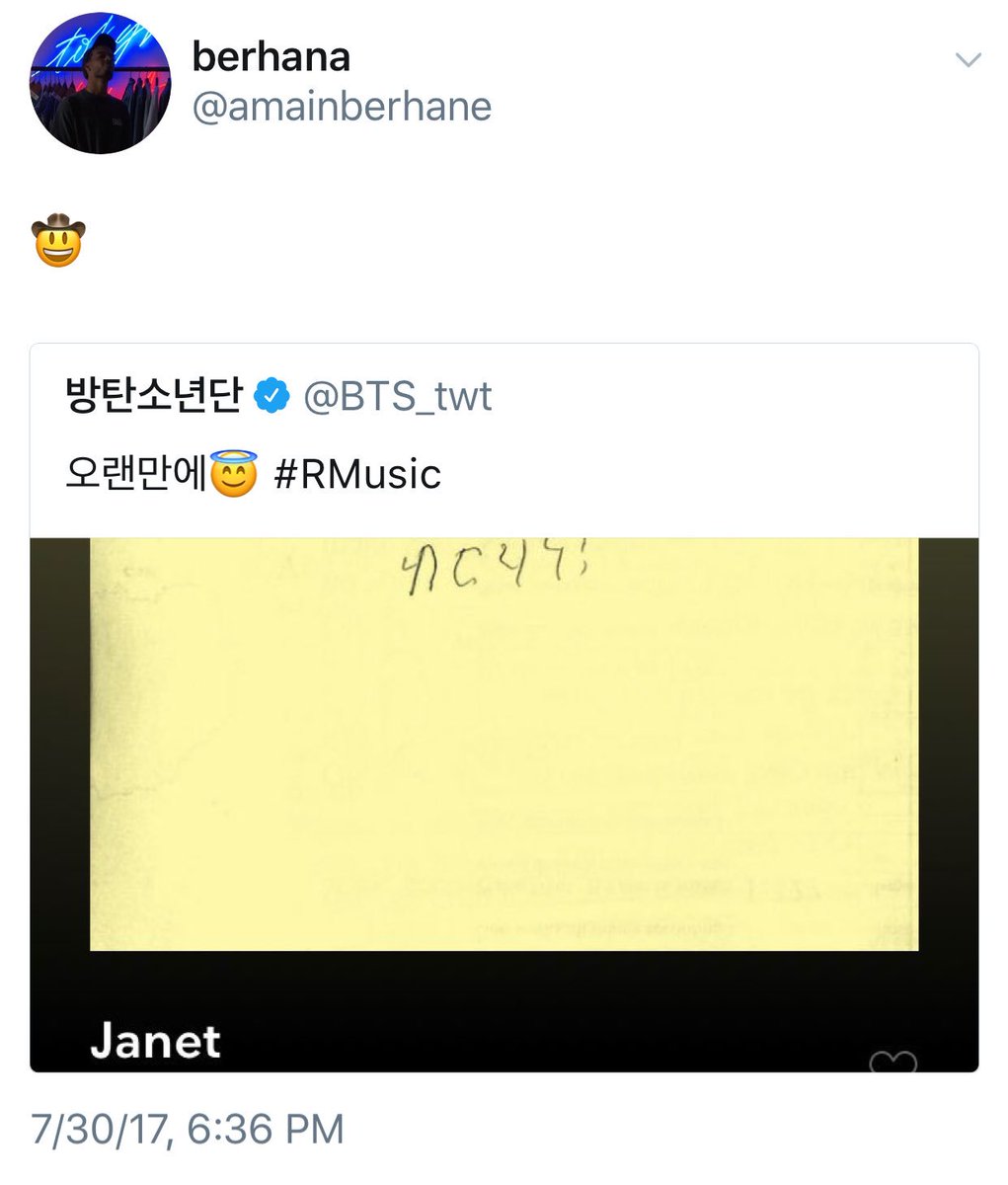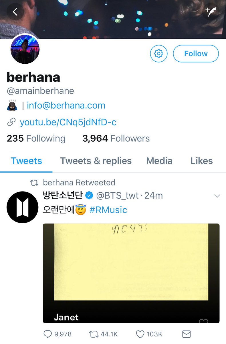 قام الفنان Berhana بأقتباس وإعادة تغريد تغريدة #نامجون الذي قام فيها بتوصية أحدى اغانية