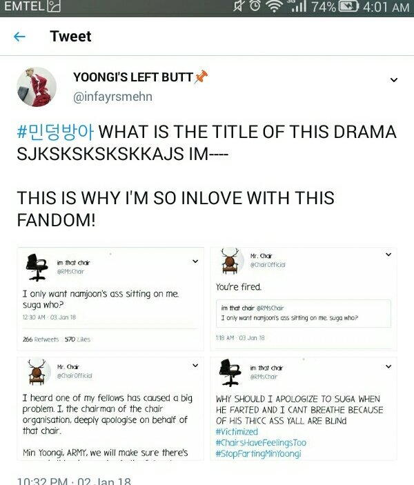 Namjoon bought Yoongi a new chair, he hit the butt with the chair. Namjoon scoffs and says that he has not done that for a year now, that now the clumsy can be yoongi. And yoongi said no, that his name is Min dongbang (Although I do not know what that means)