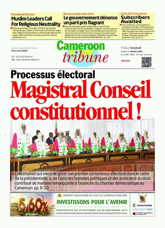 Cameroun- depuis la réélection de Biya lundi, quatre jours et Unes laudatrices du journal d'Etat: 1. mardi, "Paul Biya, la force de la victoire" 2. mercredi, "La réalité des chiffres" 3. jeudi, "Paul Biya, le rassembleur" 4. vendredi, "Magistral Conseil constitutionnel !"pic.twitter.com/0o1VvOJrga