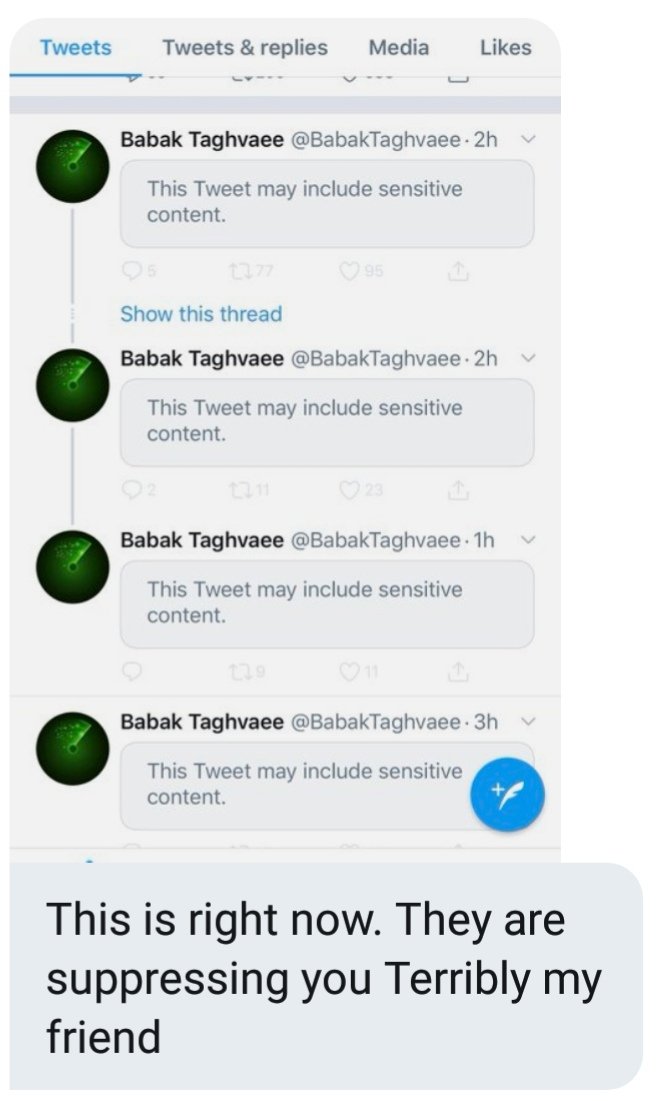 @jack shame on you. This is wrong. This guy@BabakTaghvaee should be thanked properly for his great tweets about Iranian regeim and their brutally. He is one of the best.Danke! Twitter wird dies nutzen, um deine Timeline zu verbessern. Rückgängig machenRückgängig machen
