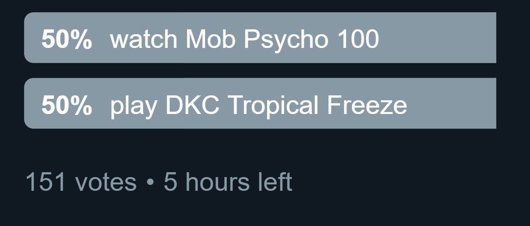 i have somehow never played Donkey Kong Country: Tropical Freeze OR watched Mob Psycho 100 before please vote on which one i finally do tonight