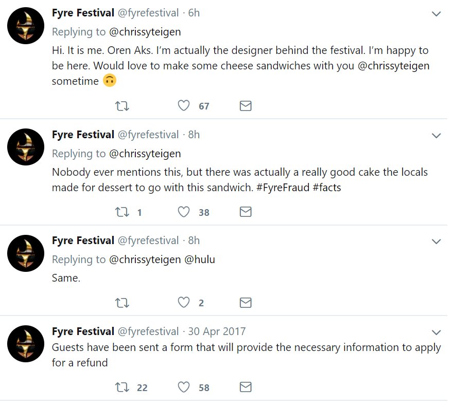 after nearly 2 years of silence, the designer behind Fyre Festival has reactivated the official Twitter account... for the sole purpose of sending tweets to Chrissy Teigenpic.twitter.com/GcSgjNuA4i