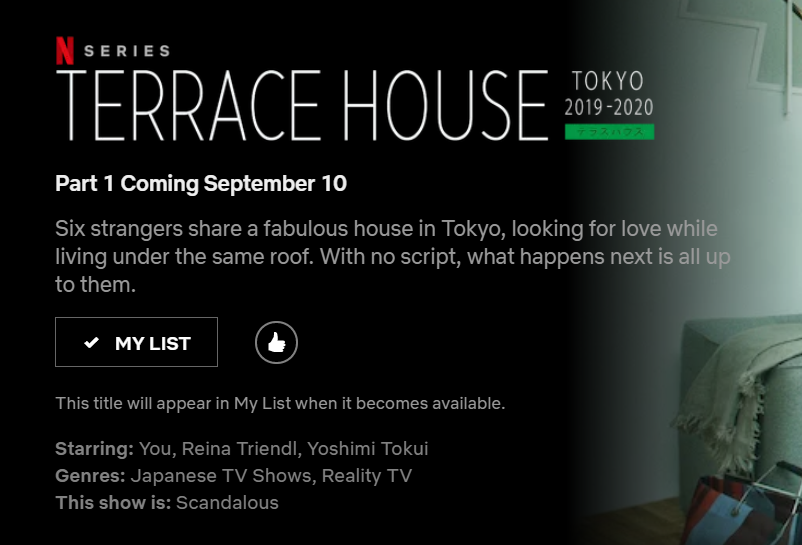 hey, Netflix just announced a US release date for the new season of Terrace House! This is great news if you: • want to wait a month to watch a show that has English subtitles already • prefer watching the show in weird 8-episode chunks rather than seeing new episodes weeklypic.twitter.com/FY3hEEz3Ba