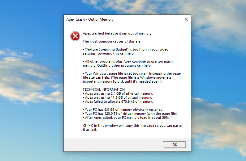 hang on, does that error say "your PC has 128 TERABYTES of virtual memory"??? that is definitely not right LMAO