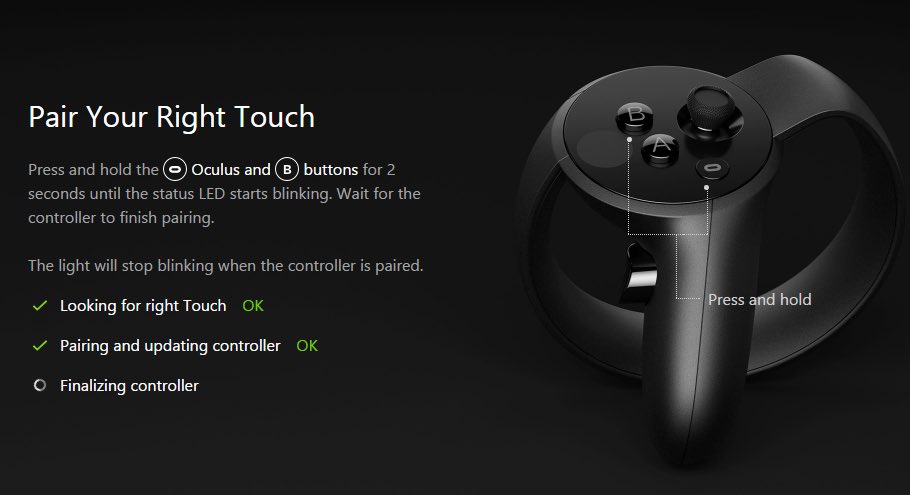 VR friends: the left Touch controller paired in seconds, but the right one is "finalizing" indefinitely. Anyone else had this experience?pic.twitter.com/8TStVwNWh0