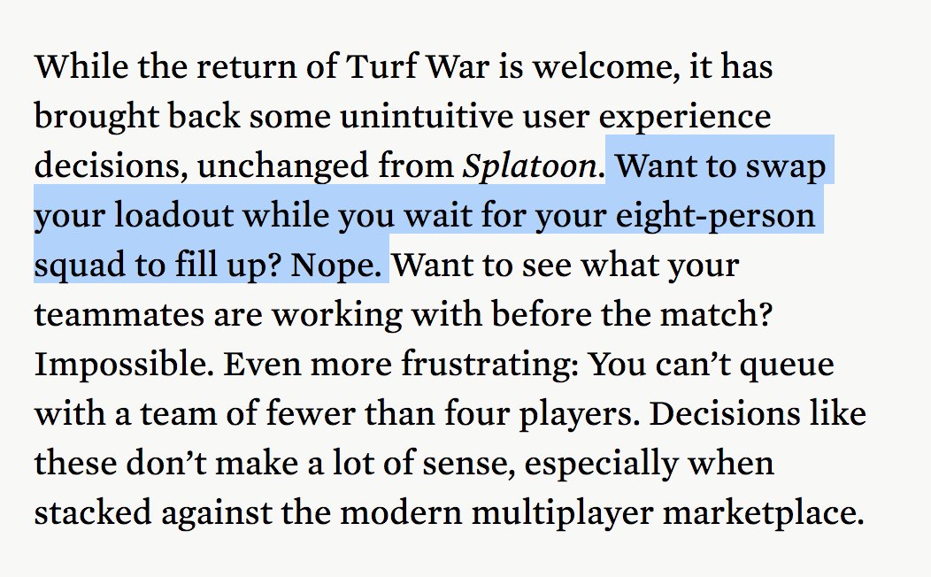 i love Splatoon 2, but the fact that you STILL can't swap your weapon between matches is maddening and unforgivable https://www.polygon.com/2017/7/18/15989698/splatoon-2-review …pic.twitter.com/EJsitK18E0