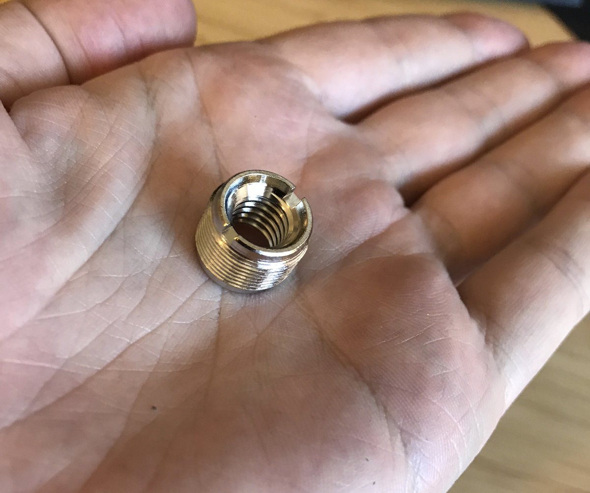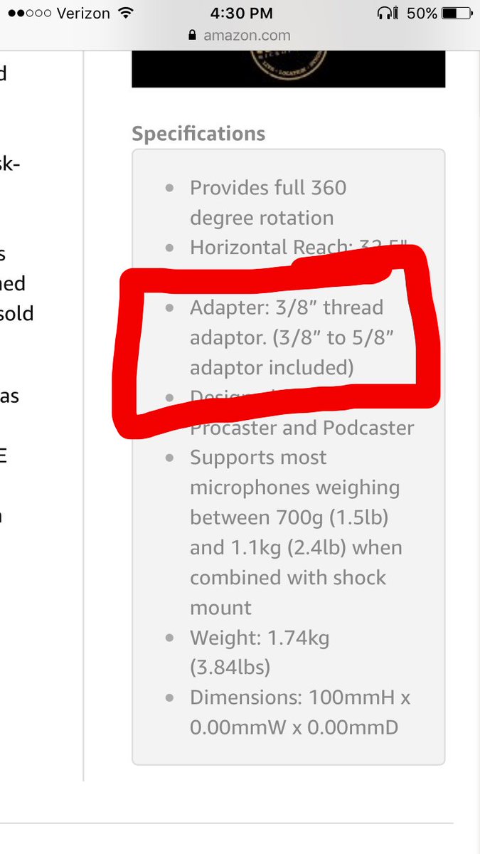 there should be a double-sided screw that came with the shock-mount that fits the arm's smaller screw (or comes out to fit a bigger one)