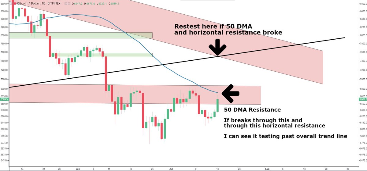 $BTC Update 50 DMA and horizontal resistance needs to break to be bullish A break could lead to a test of the old trendline at $7500 (marked by arrow) which will be a strong resistance due to its long-term historical support for Bitcoin in the pastpic.twitter.com/A16ItbDQ5A