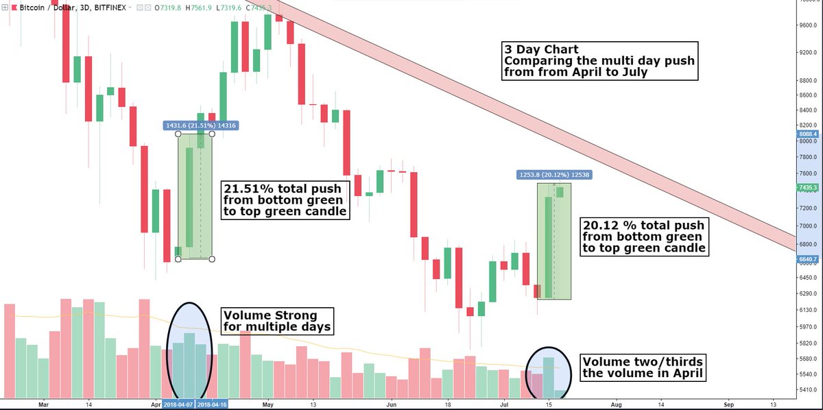 $BTC - April vs July - 3 Day Chart Showing lack of volume compared to April and fewer % gains overall in a multi-day timeline 3-Day Candle April = 21.51% gain 3-Day Candle July = 20.12% gain Not convinced of long-term reversal I'll still trade Alts, Until next push downpic.twitter.com/i2Z1XJXdhx