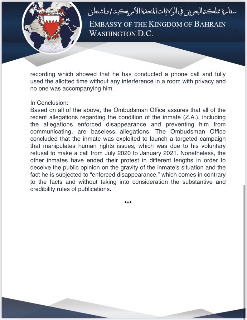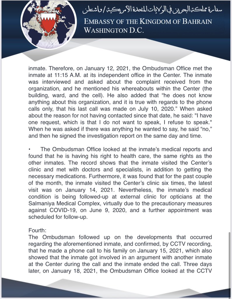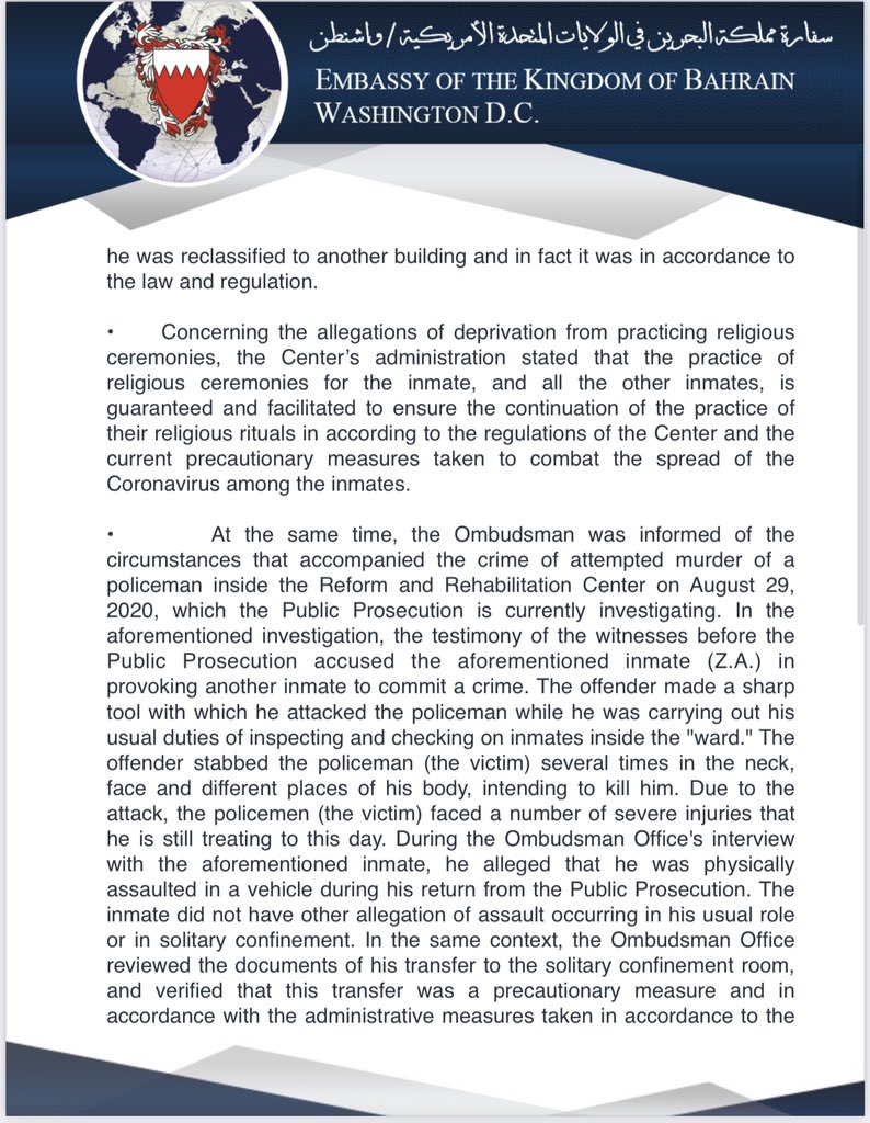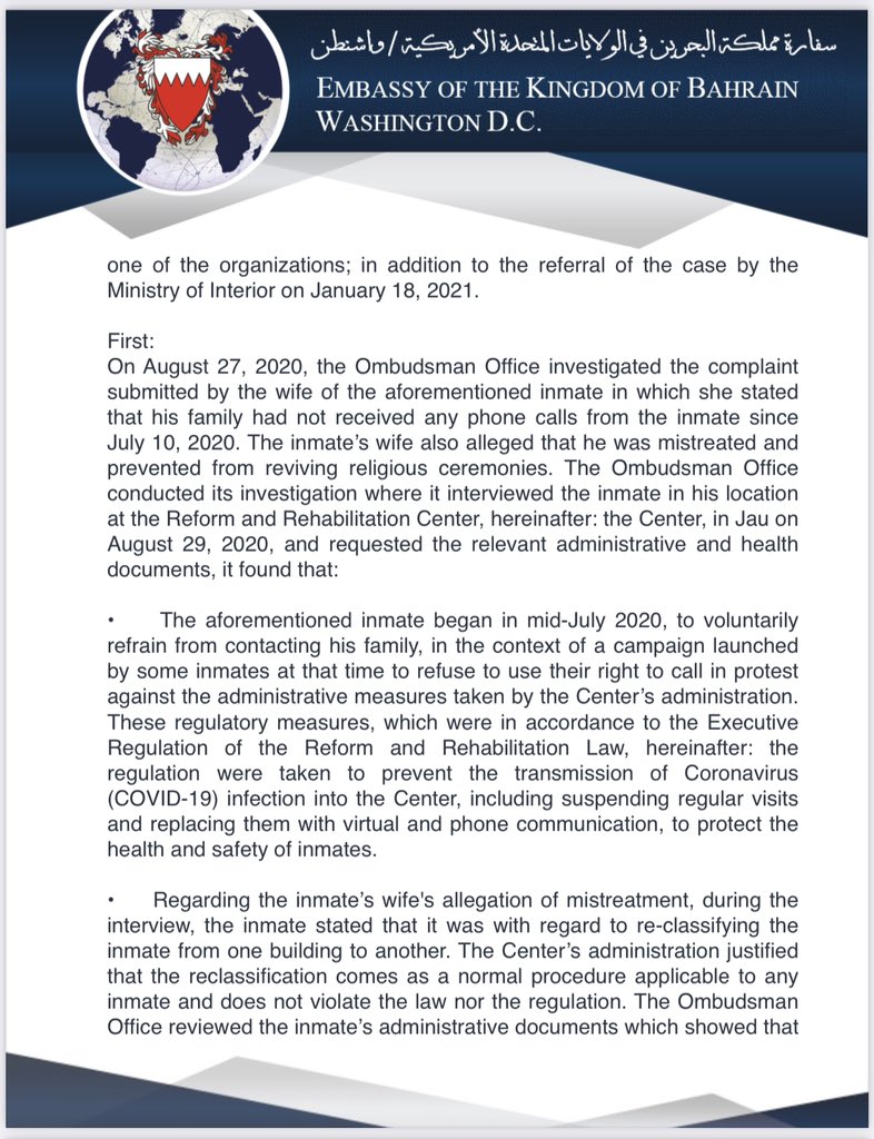 @USCIRF Chair@g_manchin’s concerns, the Embassy would like to highlight a statement by@Ombudsman_bh detailing the actions the office has taken in the case of Zuhair Abbas, a prison inmate, and their investigation findings.pic.twitter.com/gDd90U3km3