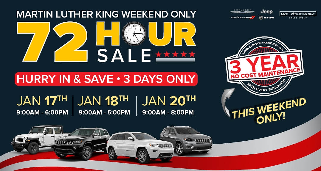 #BakerJeep is pleased to offer a 72-hour#weekend#sale in#celebration of the#MartinLutherKing
