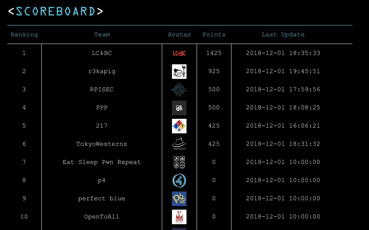 #RealWorldCTF2018 During 2days esoteric and arduous pwning, players have showed formidable gifts through the delicate exploits of them. Finally, LC↯BC(@hellman1908) win the triumph of Real World CTF 2018 Finals. Congratulations! Thanks for every CTFer!pic.twitter.com/v5iVpMWq38