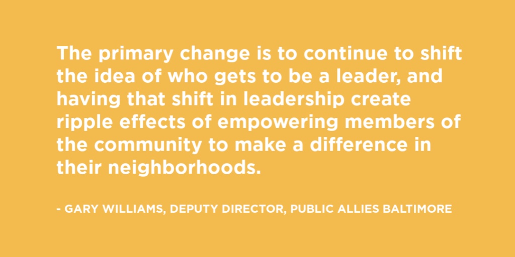 "The primary change is to continue to shift the idea of who gets to be leader, and having that shift in leadership create ripple effects empowering members of the community to make a difference in their neighborhoods." - Gary Williams, Deputy Director, Public Allies Baltimorepic.twitter.com/czwLl56dss