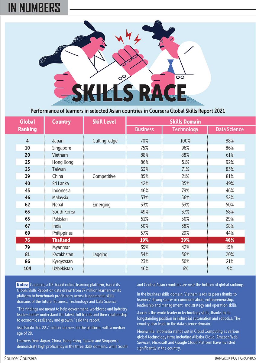 Skills race http://www.bangkokpost.com/asiafocus Performance of learners in Asian countries in Coursera Global Skills Report 2021.