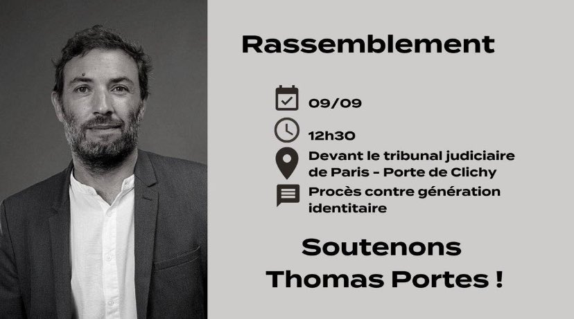 Demain soyons le plus nombreux au tribunal de Paris pour soutenir @Portes_Thomas contre Génération Identitaire ! J’y serai et j’espère vous y voir aussi, faisons bloc contre les identitaires racistes et violents