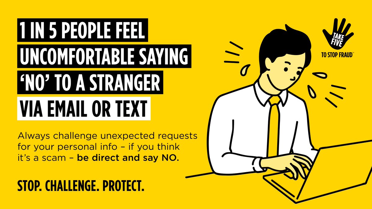 #TakeFiveWeek! Always say no if someone contacts you asking for personal or financial info. Saying ‘no’ can feel uncomfortable but it’s ok to reject, refuse or ignore requests. Only criminals will try to rush or panic you.pic.twitter.com/6u7KEkAUQ9