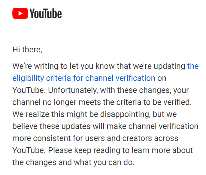 It should be easy to know when you’ve found the official YouTube channel of a creator, artist, brand, or public figure. So in late October, we’re updating what it means for channels to be “Verified” w/ new eligibility criteria & a new look. Details → https://yt.be/help/3QfB  pic.twitter.com/JXOvMbkbns