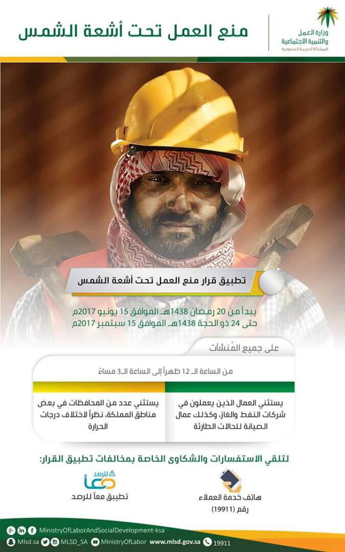 من يوم 20 رمضان : العمل ممنوع تحت الشمس من 12 ظهر حتى 3 عصر . - بلغ 19911 إذا شفت مخالفة للقرار.pic.twitter.com/N3P6pw5xRh