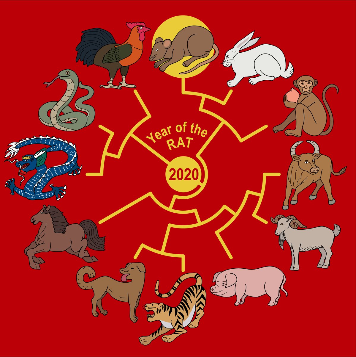 , here is an evolutionary tree (cladogram) with the 12 animals of the Chinese zodiac.