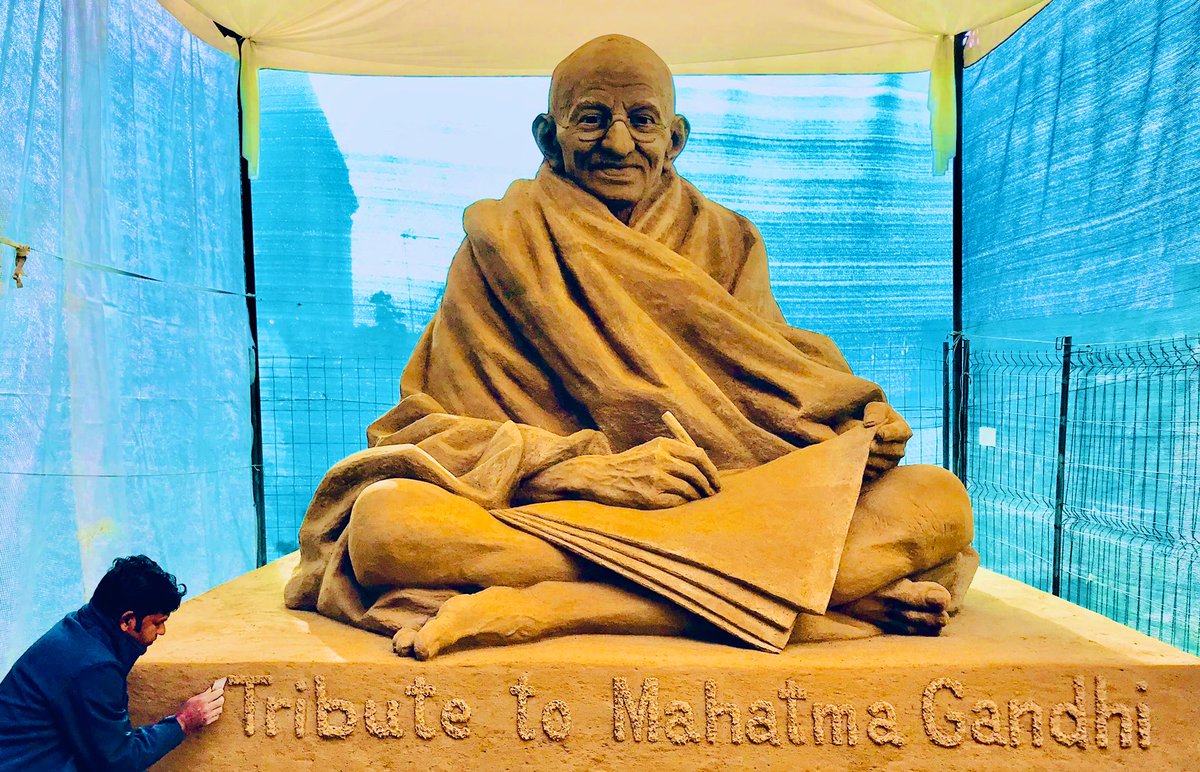 #MahatmaGandhi Ji on his Death Anniversary. Let's embrace his message of peace and universal brotherhood. I am sharing one of my SandArt .#MartyrsDaypic.twitter.com/k2IpFYtci8