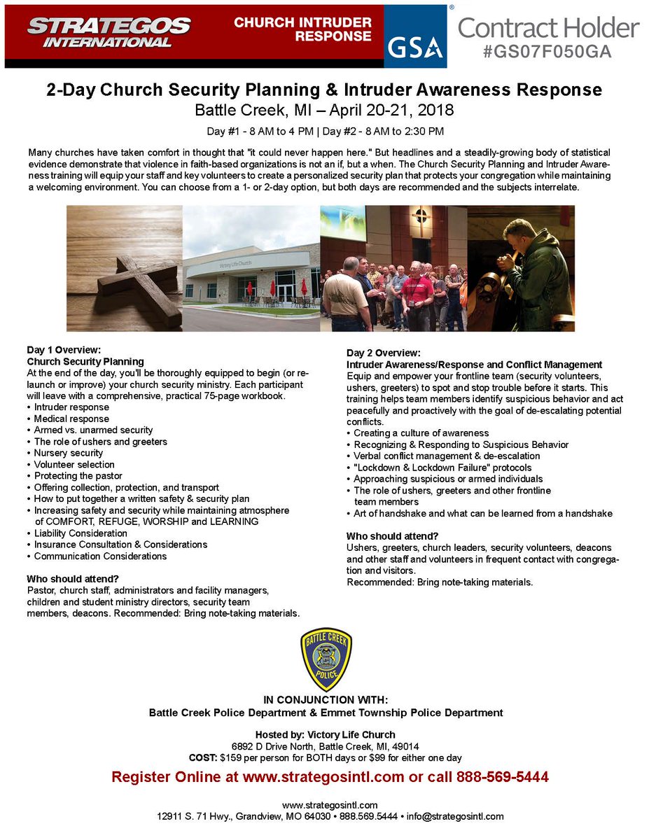 #church security training offered April 20-21 in conjunction with@BattleCreekPD &@emmettdps -- more info at the link and on the flyer! http://battlecreekmi.gov/CivicAlerts.aspx?AID=587 …pic.twitter.com/g1G1MlVJwe