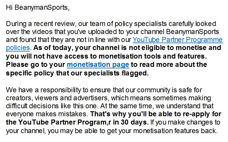 Well, this couldn't have come at a worse time, I guess it's back to my second channel again ( https://www.youtube.com/MrBeanyman  ) while I wait for this to get sorted, last time it took 3 weeks, will start working on the pre-match videos now @TeamYouTubehttps://twitter.com/BeanymanSports/status/1016842130701144064 …
