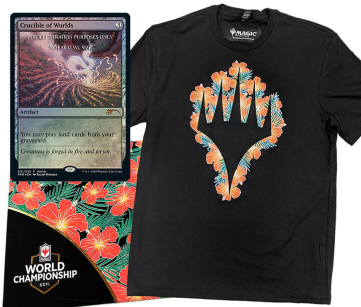 I heard lots of feedback yesterday from people who were interested in that Crucible of Worlds promo but didn't have a store to get it at. And I have good news: it's included in the Worlds bundles with a sweet playmat and shirt to boot! Check it: https://mtgproshop.com/