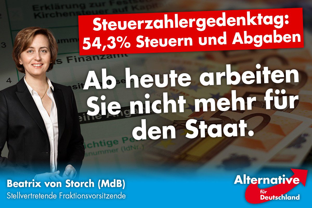 Noch nie haben die Deutschen so lange für den Staat gearbeitet wie in diesem Jahr. Nicht einmal mehr die Hälfte von jedem verdienten Euro bleibt dem hart arbeitenden Bürger zur freien Verfügung übrig. Dieser Sozialismus muss endlich enden - Steuern und Abgaben massiv senken!