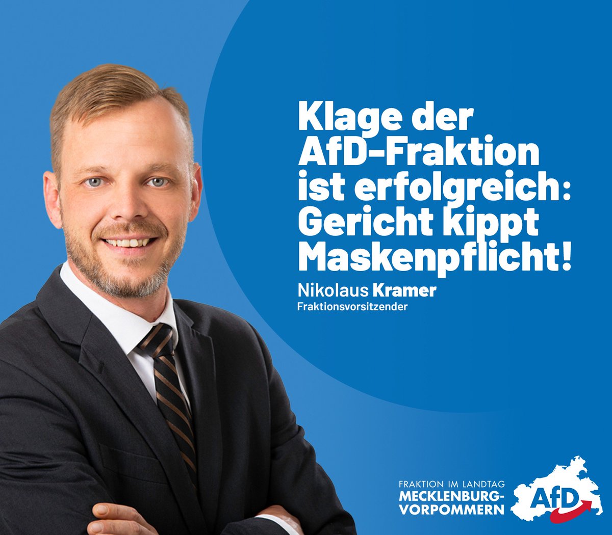 #Maskenpflicht adé nun auch in MeckPomm. Das OVG kippt die#hotspotregel. Was natürlich niemand berichtet: Kläger waren die MdL der AfD-Fraktion.#afdwirkt