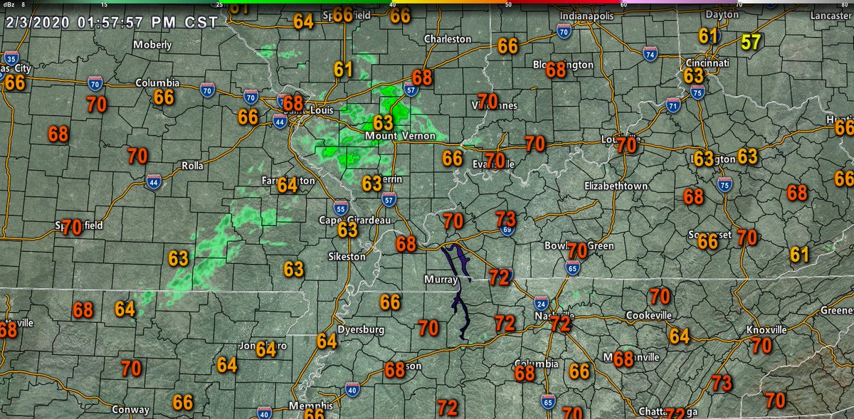 #tristatewx#ilwx#mowx#kywx#tnwx 2/2/20 High temps are just about spot-on today. With one exception. The far northern portion of southeast Missouri into Randolph County, Illinois. Temperatures have hit the middle 70s! Record warmth in those areas.pic.twitter.com/fY3b7GLwOt