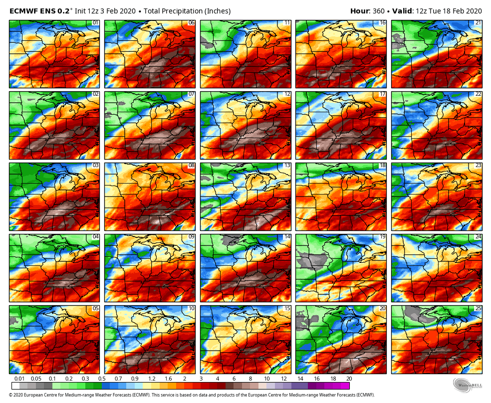 #wet#tristatewx#active 2/3/20 An active pattern over the next 10 to 15 days with multiple precip events. Mosty rain & storms. The EC model guidance shows the active precip pattern quite well. Each window is one ensemble members. The more that agree the higher the confidence.pic.twitter.com/3imnPyf2pM