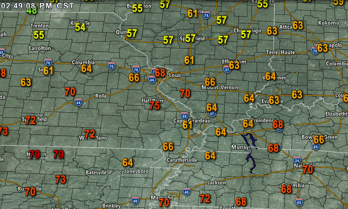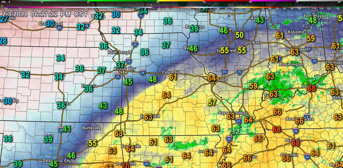 #tristatewx#ilwx#mowx#kywx#tnwx 2/4/2020 1 PM. You can clearly see where the cold front is located. A LARGE temp gradient across the region.pic.twitter.com/BrLl20clCv