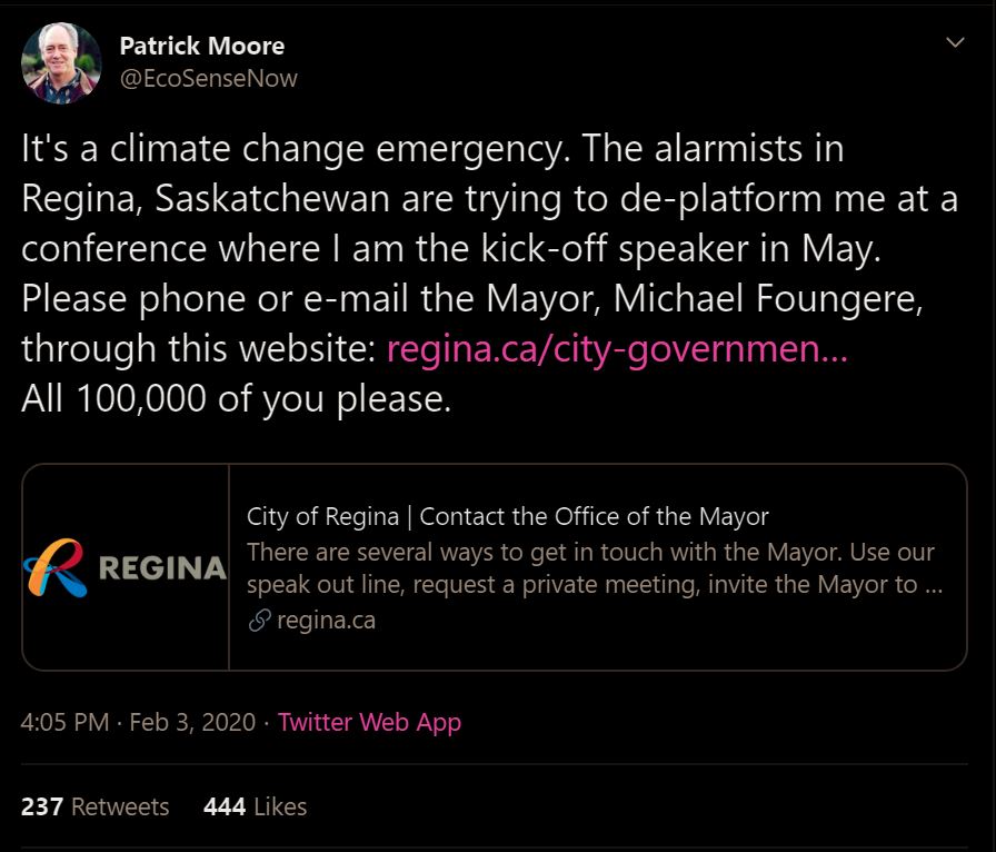 #Canadian city of#Regina,#Saskatchewan will reject giving a platform to a anti Science,#ClimateDenier, & paid industry lobbyist. There are 1000’s of actual#climate researchers & experts who should speak at a sustainability conference, not Moore!@CityofReginahttps://twitter.com/sciencenotdogma/status/1224502968151445505 …