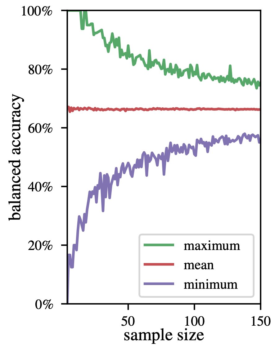 Mimicked smaller studies by subsampling reveals strong effect of training AND test size. Even with N~100, estimated accuracies vary by >20%