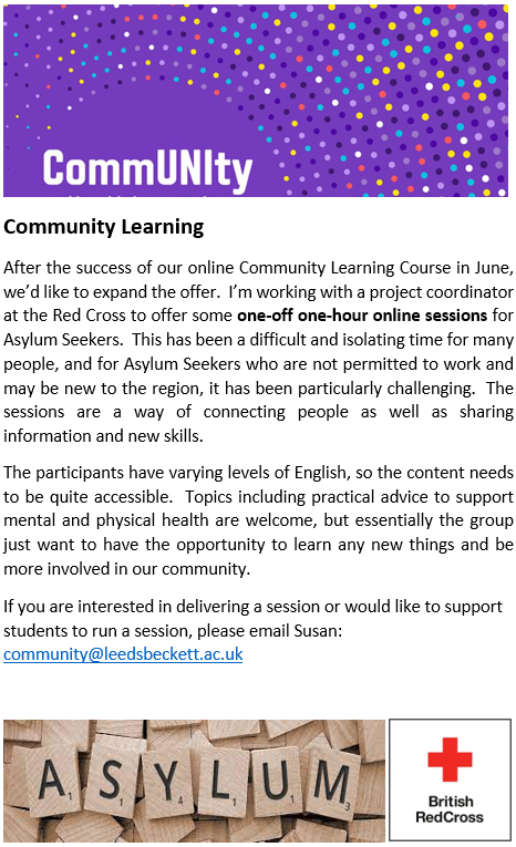 #LeedBeckett students or staff to deliver some online sessions for asylum seekers to promote health & wellbeing and inclusion. Any volunteers?@LeedsBeckettSU@LBUHealth@LBU_PTMH@LBUPsych@LBUPlayworking@OTLeedsBeckett#AsylumSeekers#Health#inclusionpic.twitter.com/KvuxAsxLsW