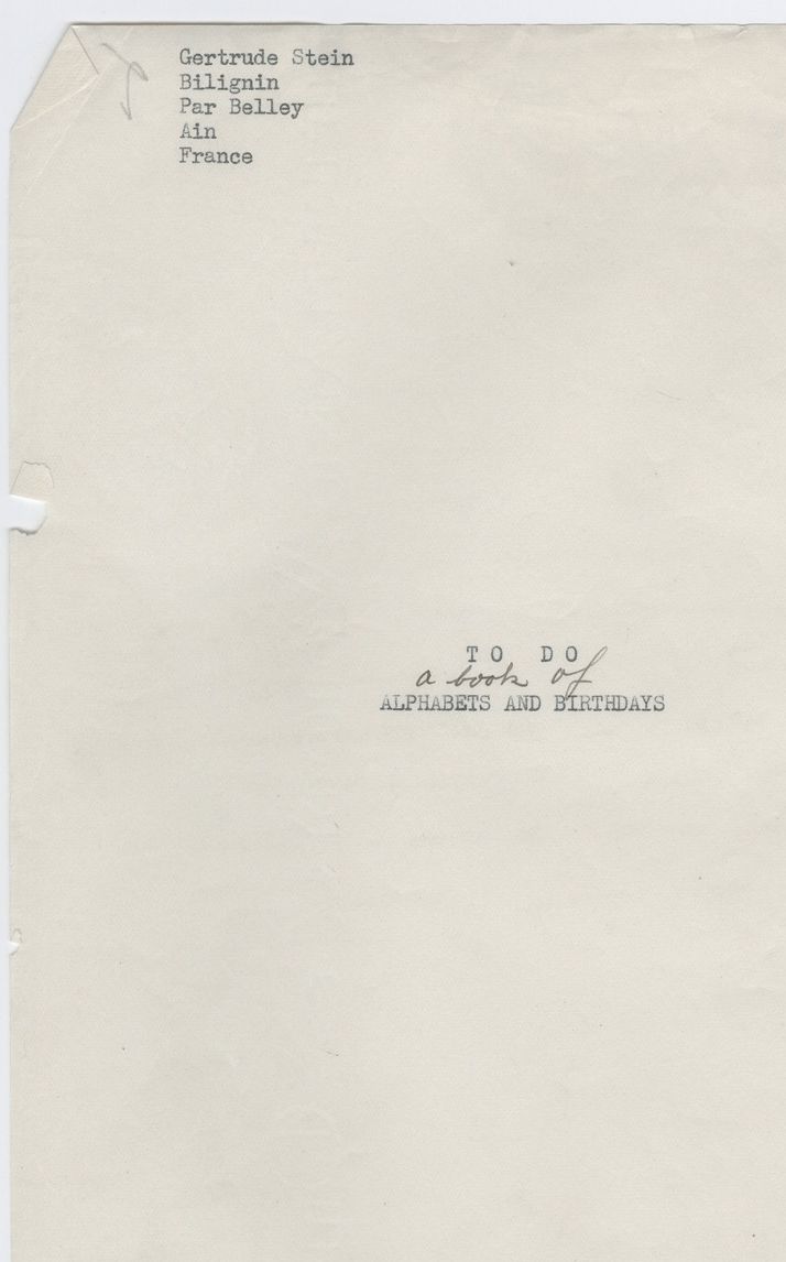 TO DO a book of ALPHABETS AND BIRTHDAYS: Gertrude Stein, Bilignin Typescript, selected pages: https://bit.ly/2RX7G8B MS notebook I: https://bit.ly/31kDpDH more of Gertrude Stein and Alice B. Toklas Papers https://bit.ly/2IzlPEv