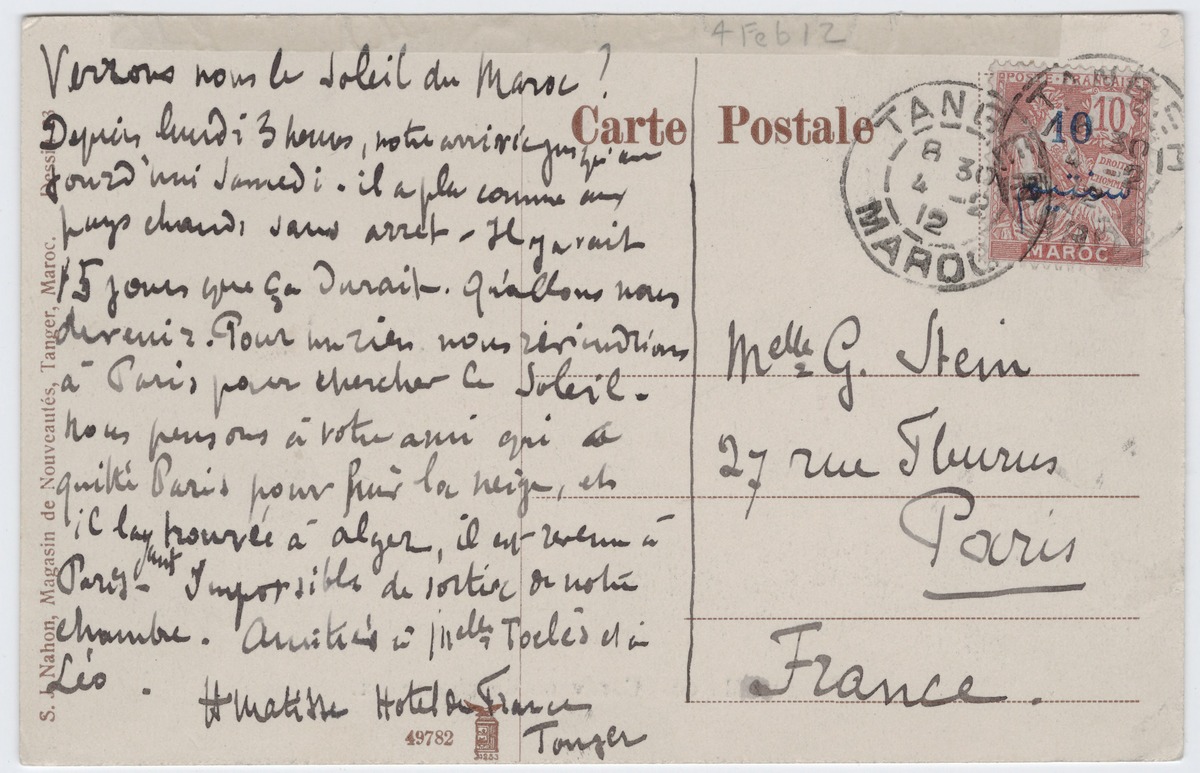 Henri Matisse postcard to Gertrude Stein, 2/4/1912, in Gertrude Stein and Alice B. Toklas Papers https://beinecke.library.yale.edu/collections/highlights/gertrude-stein-and-alice-b-toklas-papers …pic.twitter.com/cZBdN9KdSn