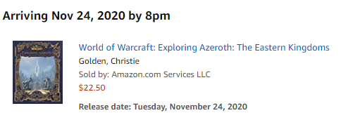 "Blizzard has again delayed the upcoming World of Warcraft: Exploring Azeroth: Eastern Kingdoms book by Christie Golden to December 3, 2020" It used to be released 1 week prior to Shadowlands release originally