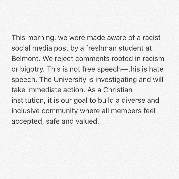 @BelmontUniv to take with Justin Woodard is expulsion.#racism#bigotrypic.twitter.com/Hzx1puIH8W