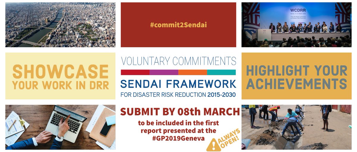 How are you working to build #ResilienceForAll? Showcase your #DRR initiative here: https://sendaicommitments.unisdr.org/ Submit by 8th March and be included in the first commitments report presented at the #GP2019Geneva! #commit2Sendai pic.twitter.com/Pv8KAqDoog