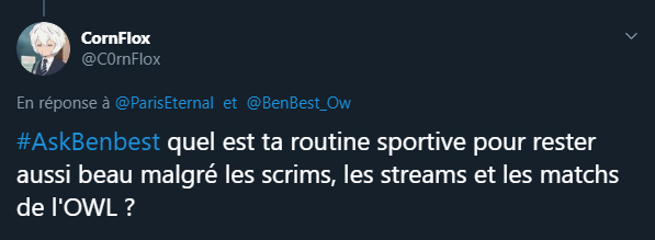 .@C0rnFlox: "What is your sports routine to stay so handsome despite scrims, streams and OWL matches?"