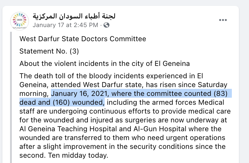 Please do take a read. https://www.bbc.co.uk/news/world-africa-55695118 … https://www.aljazeera.com/news/2021/1/19/sudan-troops-deployed-in-darfur-after-clashes-kill-155 … https://www.voanews.com/africa/least-48-dead-militia-attack-el-geneina-west-darfur-says-suna … https://www.middleeasteye.net/news/darfur-sudan-clashes-troops-deployed … https://news.un.org/en/story/2021/01/1082352 …