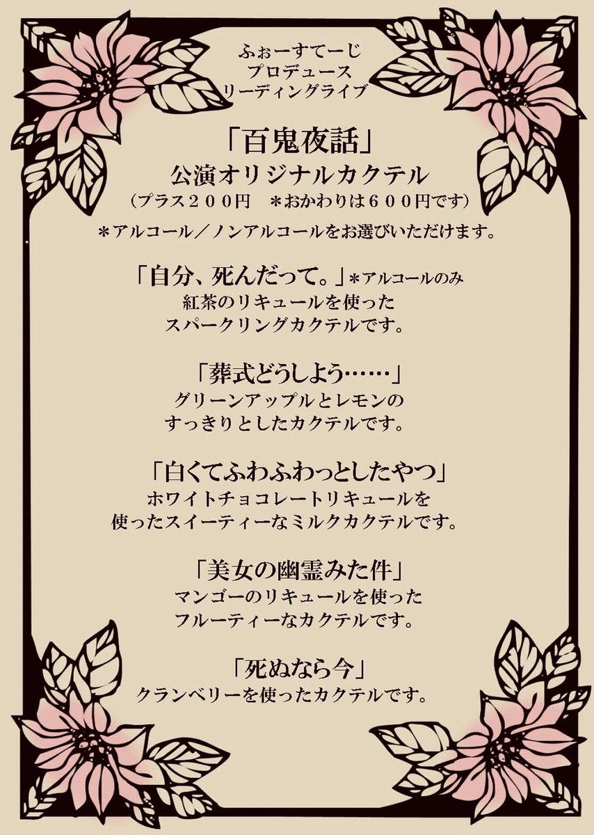 4度目の正直、「百鬼夜話」 お陰様で完売目前! 現在予約可能なのは 4日(土) 14時 5日(日) 17時 のみとなっております。 そして今回もオリジナルカクテルがございますよ