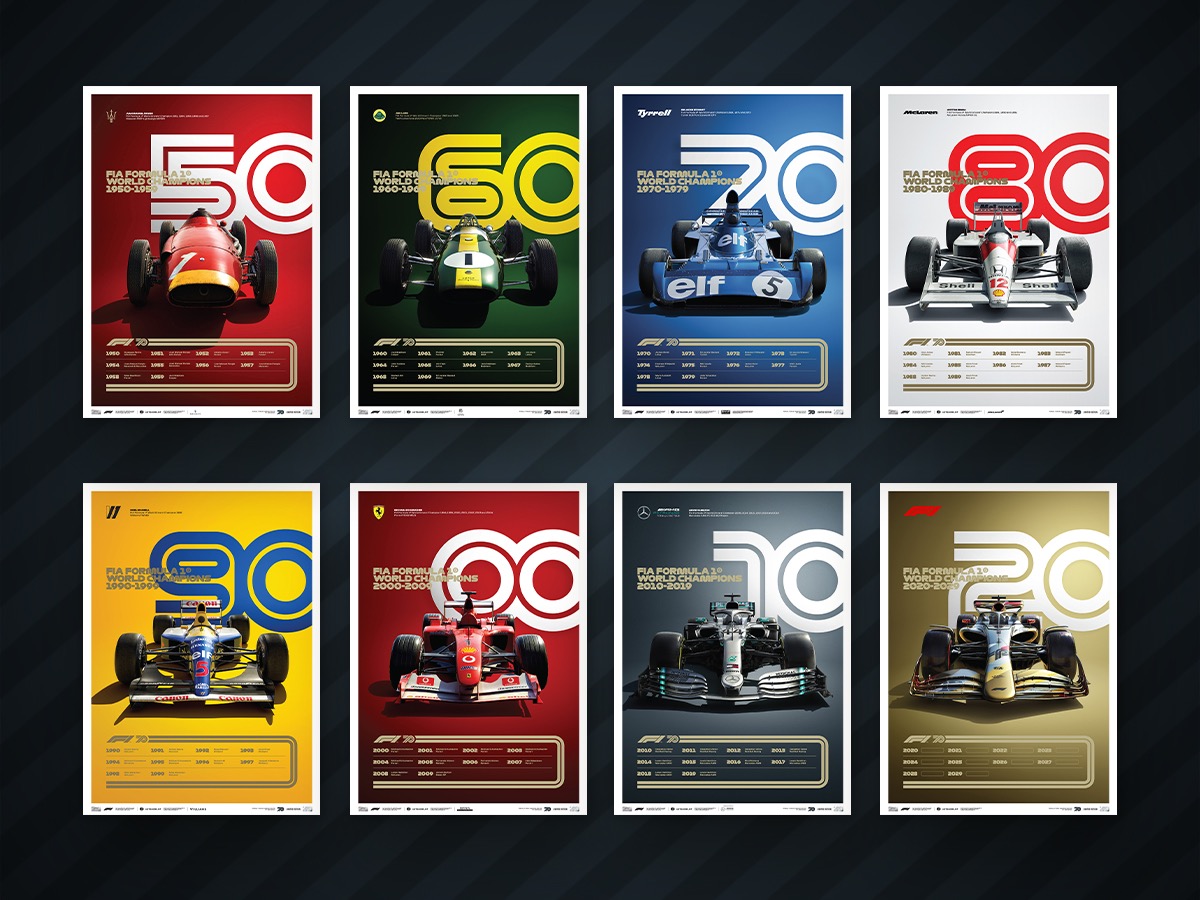 I nuovi poster della #F1 per omaggiare i 70 anni del mondiale F1 che si festeggia a Silverstone. Ogni poster riproduce un’auto mitica di quel decennio. Maserati di Fangio, Lotus di Clark, Tyrrell di Stewart, McLaren di Senna, Williams di Mansell, Ferrari di Schumi e Mercedespic.twitter.com/w493Zrkz1L