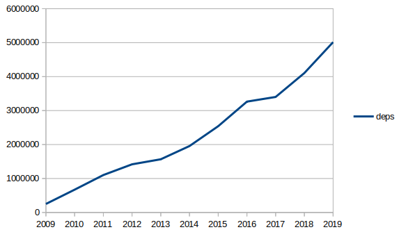 deps is an order of magnitude larger than everything else, had to split it to a separate graph to allow any detail for the other parts of the nodejs repo. this data based on `cloc` result from last commit of each year.pic.twitter.com/p1NU6uNZNg