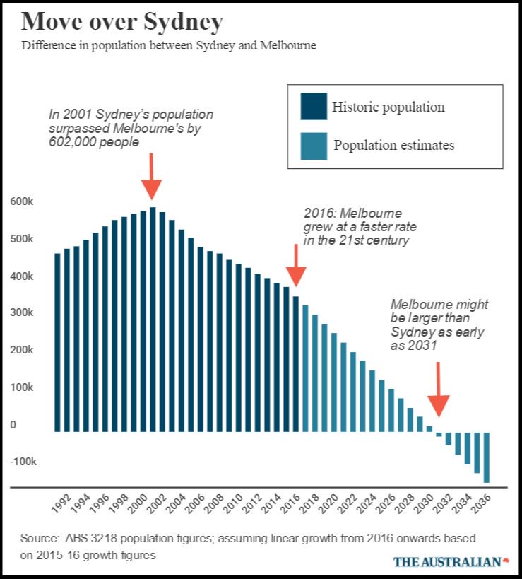 #Melbourne could be bigger than#Sydney as early as 2031. What pulls population towards Melbourne? Cheaper housing!? https://goo.gl/RdXGDG pic.twitter.com/iDFeJ737SB