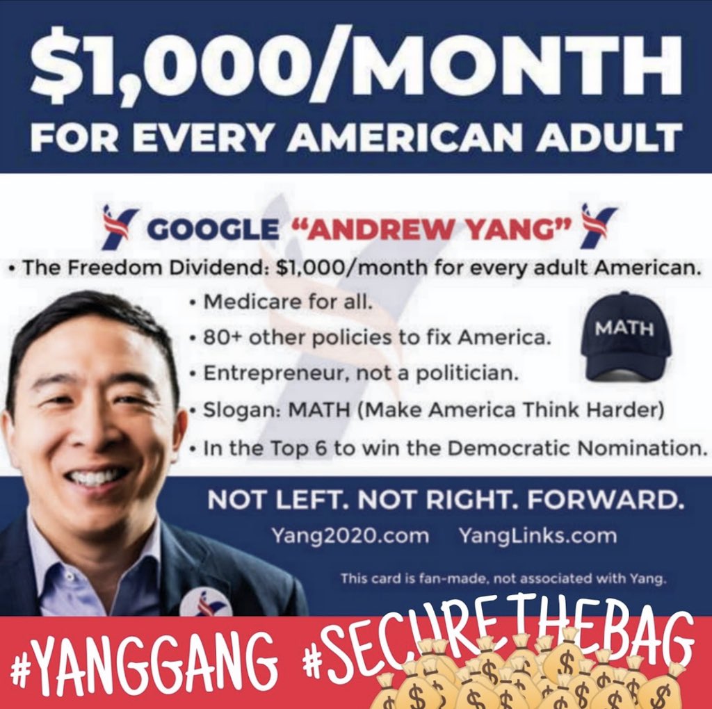How about we make billionaires pay their fair share of taxes so we get better infrastructure, Medicare for all, free college, fight climate change (Yang wants us to move from the coasts and not fight it LOL), end police brutality, end foreign wars. Sounds better than $1k a month
